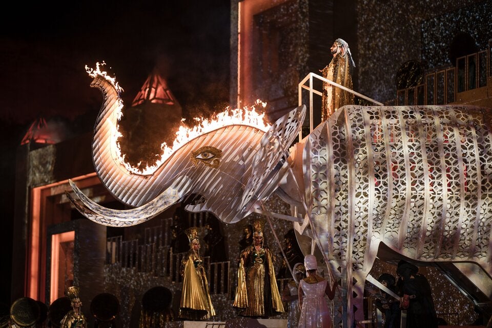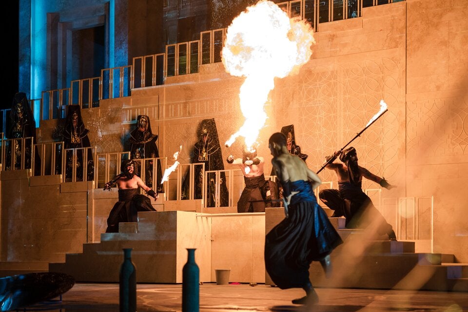 Regisseur Strassberger, der 2021 bereits Turndot mit Feuer und Farbrausch in Szene gesetzt hatte, ist mit dieser "Aida" ein Spektakel gelungen, wie es selbst der Römersteinbruch kaum je gesehen hat. Bereits das Bühnenbild, für das Strassberger diesmal selbst verantwortlich zeichnet, ist ein Hingucker. Über dem ägyptischen Tempel, der mit Einsetzen der Dunkelheit zur Projektionsfläche wird, thront ein gigantischer Sarkophag mit Pharao-Relief. Der Nil fließt nicht nur symbolisch, sondern mit echtem Wasser. Brennende Elefanten, dampfende Obelisken und meterhohe Wasserfontänen kredenzen dem Publikum einen deftigen Augenschmaus.