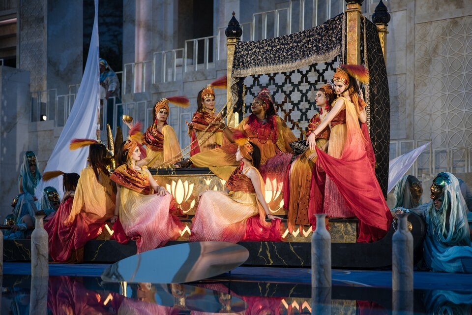 Doch kann derartige Opulenz auch rasch zu Übersättigung führen. Blickt man nach rechts zu den halsbrecherischen Schwertkämpfern, verpasst man die Feuerjongleure auf der linken Bühnenseite und umgekehrt. Vor allem aber läuft man Gefahr, das zu vernachlässigen, worum es in der Oper eigentlich gehen sollte, nämlich die Erzählung, die Musik, die Stimmen und die damit transportierten großen Gefühle. Noch dazu tragen Giuseppe Palellas glitzernde Fantasiekostüme in ihrer visuellen Dominanz dazu bei, dass manche darstellerische Leistung wenig zur Geltung kommt und die Sänger in ihnen beinahe zu verschwinden scheinen.