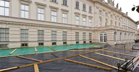 Der undichte Tiefspeicher der Wiener Albertina wird bis Mitte Oktober saniert - genaugenommen der Bereich über dem Depot. Die Basteioberfläche wird dazu zum Teil abgetragen und eine neue Isolier-Schutzschicht eingezogen.