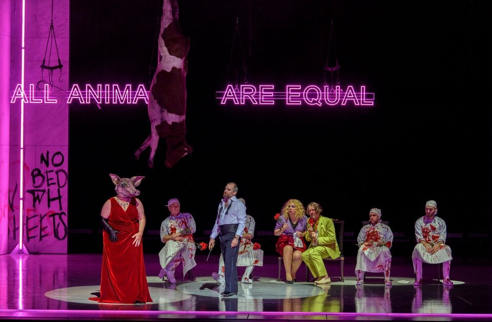 Den Wunsch, diesen Stoff auf die Opernbühne zu bringen, hat Regisseur Damiano Michieletto, der mit der Produktion sein Debüt im Haus am Ring gibt, lange gehegt. In Alexander Raskatov fand er einen idealen Partner. Ihm war es wichtig, Orwells Außenansicht des Sowjetimperiums mit Innensichten des Systems zu verbinden, indem er Originalzitate von Stalin, Trotzki und des Geheimdienstchefs Beria einarbeitete, dabei auch die sexualisierten Gewalttaten des Letzteren miteinbeziehend. Sprachlich drängte Raskatov auf Verknappung und Verdichtung sowie darauf, die Erzählung in möglichst plastische Situationen zu übersetzen. Regisseur Michieletto hat das Geschehen nicht auf einem Bauernhof, sondern in einem Schlachthof verortet.