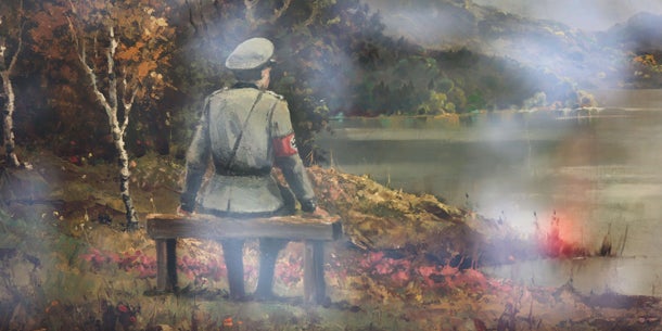 Das Projekt ist trotz des wohltätigen Hintergrunds nicht unumstritten. Banksy hatte ein kitschiges Landschaftsgemälde in einem Trödelladen gekauft und die Bergidylle durch ein Detail bereichert: Nun sitzt ein Mann in Naziuniform mit Hakenkreuz-Armbinde auf einer einfachen Holzbank im Bildvordergrund und schaut offenbar versonnen auf das Bergpanorama.