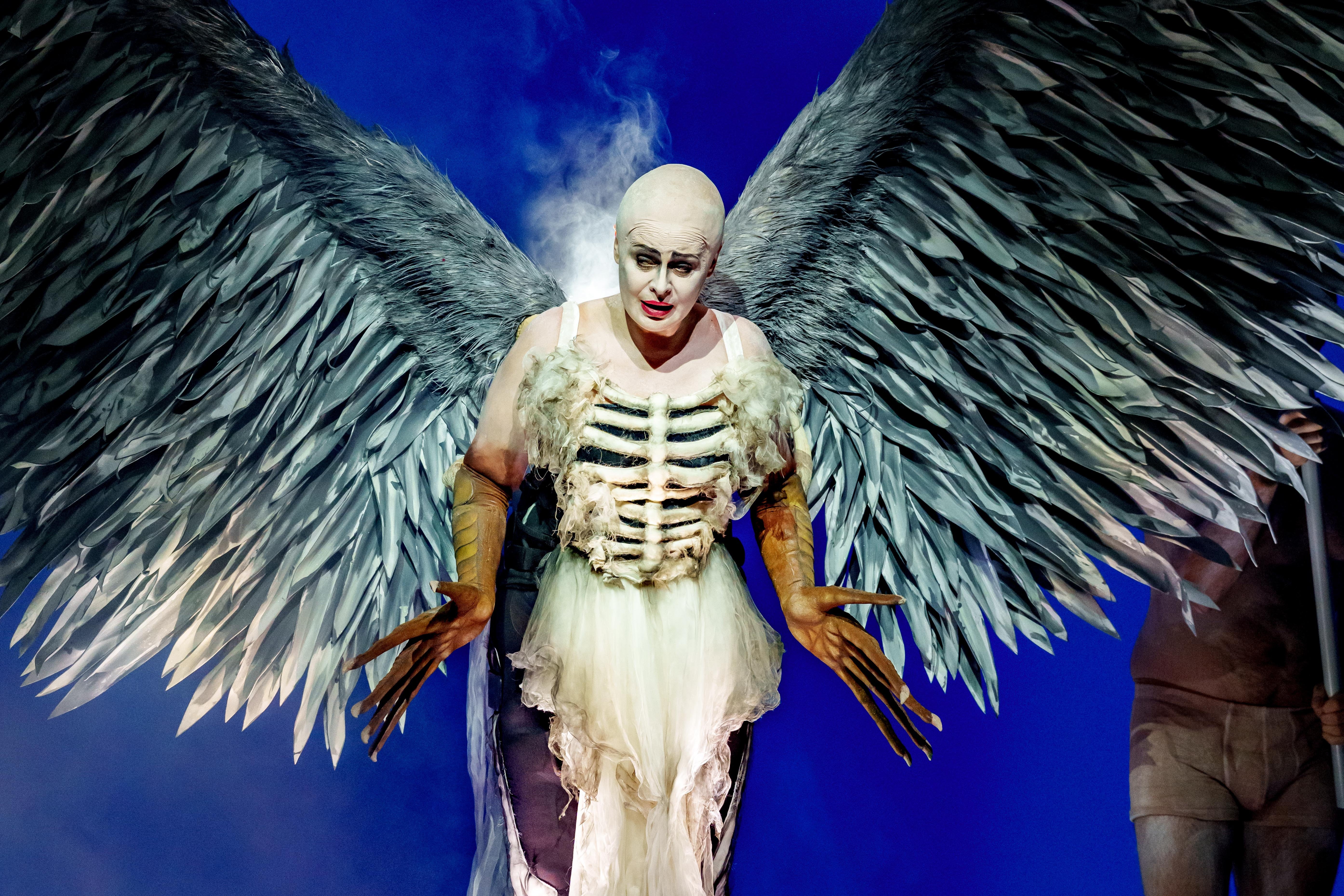 In kräftigen Rottönen feiert um eine lodernde Feuerschale das Volk von Theben ausgelassen die Geburt eines Thronfolgers, ehe Tirésias den bitteren Spaßverderber gibt und den Orakelspruch enthüllt, den König Laïos vor seiner Frau und seinem Volk enthüllt hat und nicht erst seit Sigmund Freud Teil der Kultur- und Zivilisationsgeschichte des Westens ist: Sein Sohn werde ihn dereinst erschlagen und seine eigene Mutter heiraten. Die Mordtat selbst, mit der sich der erste Teil des Fluchs erfüllt, wird von Kriegenburg in weiße Nebelwolken gehüllt. Von dort geht es ins Blaue hinein - und zur Sphinx, die so gar nichts Altägyptisches an sich hat, sondern ein Todesengel mit riesigen, von vier Sklaven bewegten Flügeln ist.