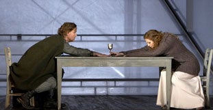 Oper. 1. Akt. Auf der Bühne ein Küchentisch und ein Sessel. Links hinter einem Paravent drei rote Brokatstühle und zwei Kleiderständer. Dort hält sich auch ein farbiger Voyeur versteckt. Das ist Wotan, der den keimenden Inzest im Hause Hunding beobachten will.