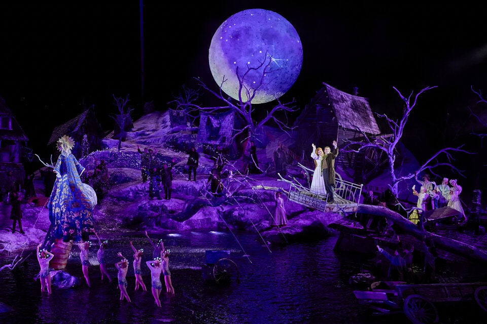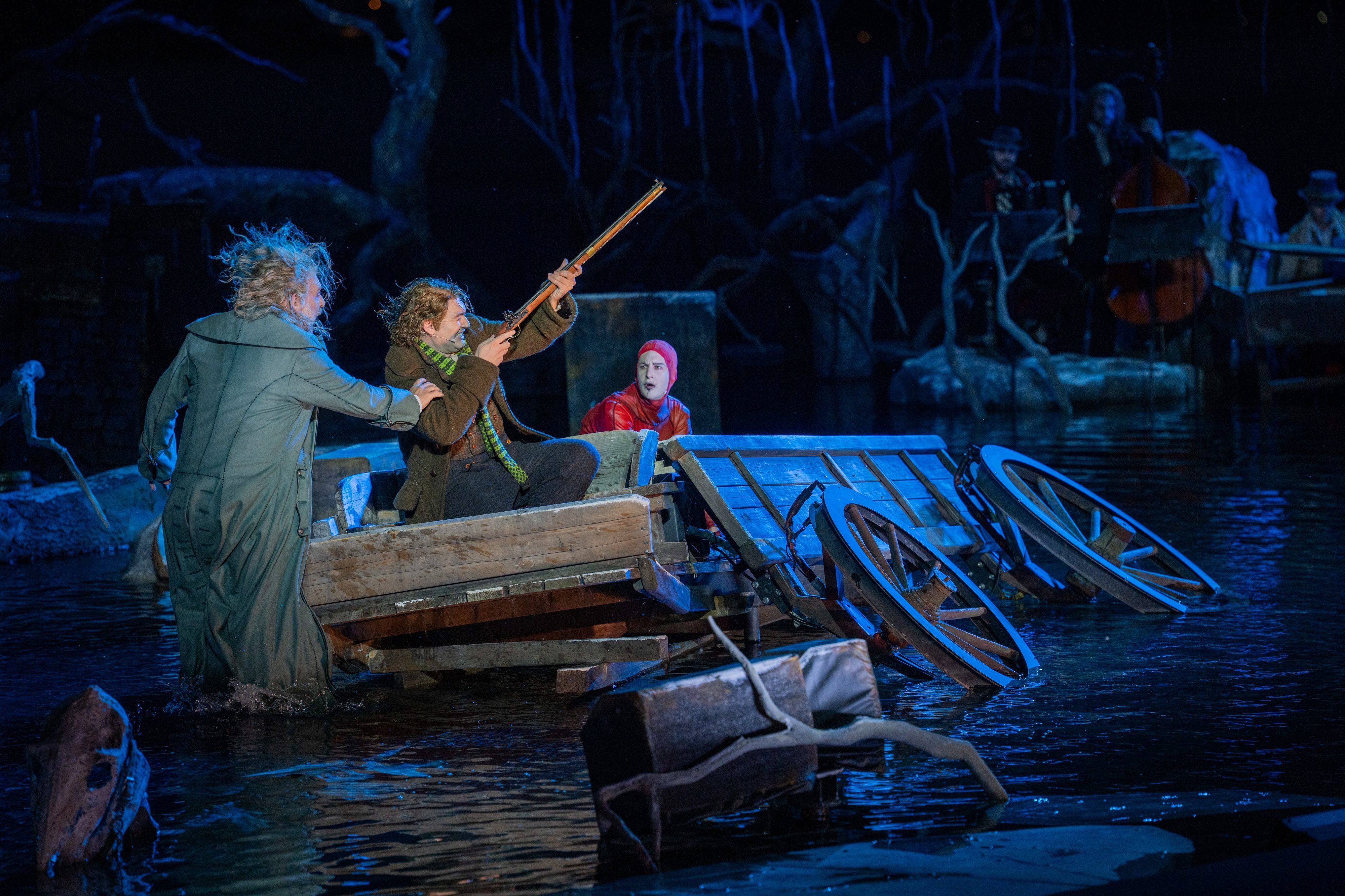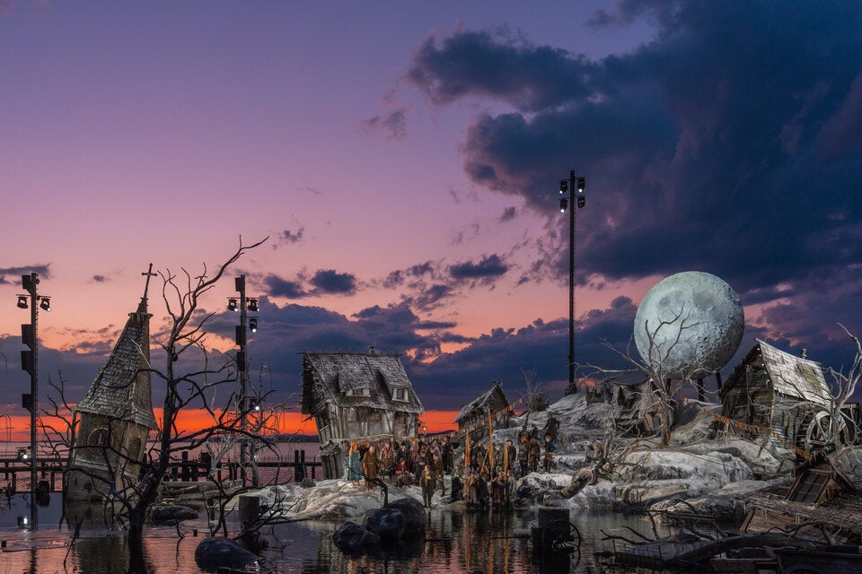 Die aus dem Vorjahr stammende Inszenierung von Philipp Stölzl wurde ein wenig aufpoliert und akzentuiert, ansonsten aber nicht verändert. Kein Wunder, sorgte sie 2024 erstens für brechend volle Zuschauerränge, und steht sie zweitens exemplarisch für das Seebühnen-Konzept des Populären, das mit großer Geste neue Fans für das Genre gewinnen möchte, um sie in der Folge mit Diffizilerem zu konfrontieren. Für den "Freischütz" bedeutet das, dass der romantischen Oper jede Romantik ausgetrieben wird und man stattdessen bei Grusel und Horror landet. Philipp Stölzls postapokalyptische Winterlandschaft wirkt mit ihren toten Bäumen, einsturzgefährdeten Häusern und Hochwasserrelikten wie eine Mischung aus Breugel und Bosch.