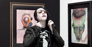Manson, mit pinkem Augenstreifen maskiert, zückte,