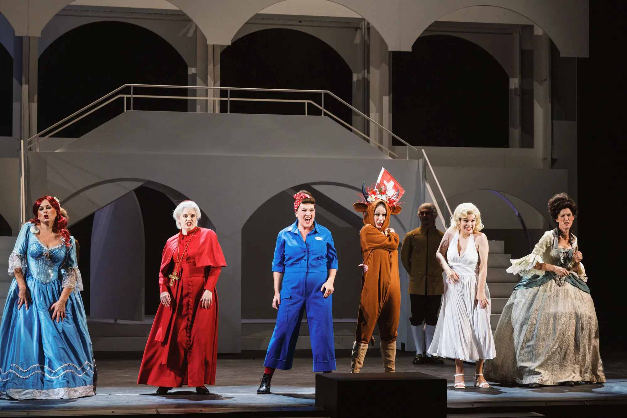 Nicht alle Gags waren bei der Premiere Schenkelklopfer, aber sie zündeten immerhin fast immer. Das ist dem Cast zu verdanken, denn auch die Sänger zeigen gute komödiantische Mimik und Timing. Wobei besonders die tollpatschigen Nebenfiguren viel vom Humor tragen, etwa die exzentrischen Untertanen Ciboletta (Juliette Khalil) und Pappacoda (Jakob Semotan) oder der Lakai Caramello (David Kerber) und der gierige Senator Delaqua (Marco Di Sapia).