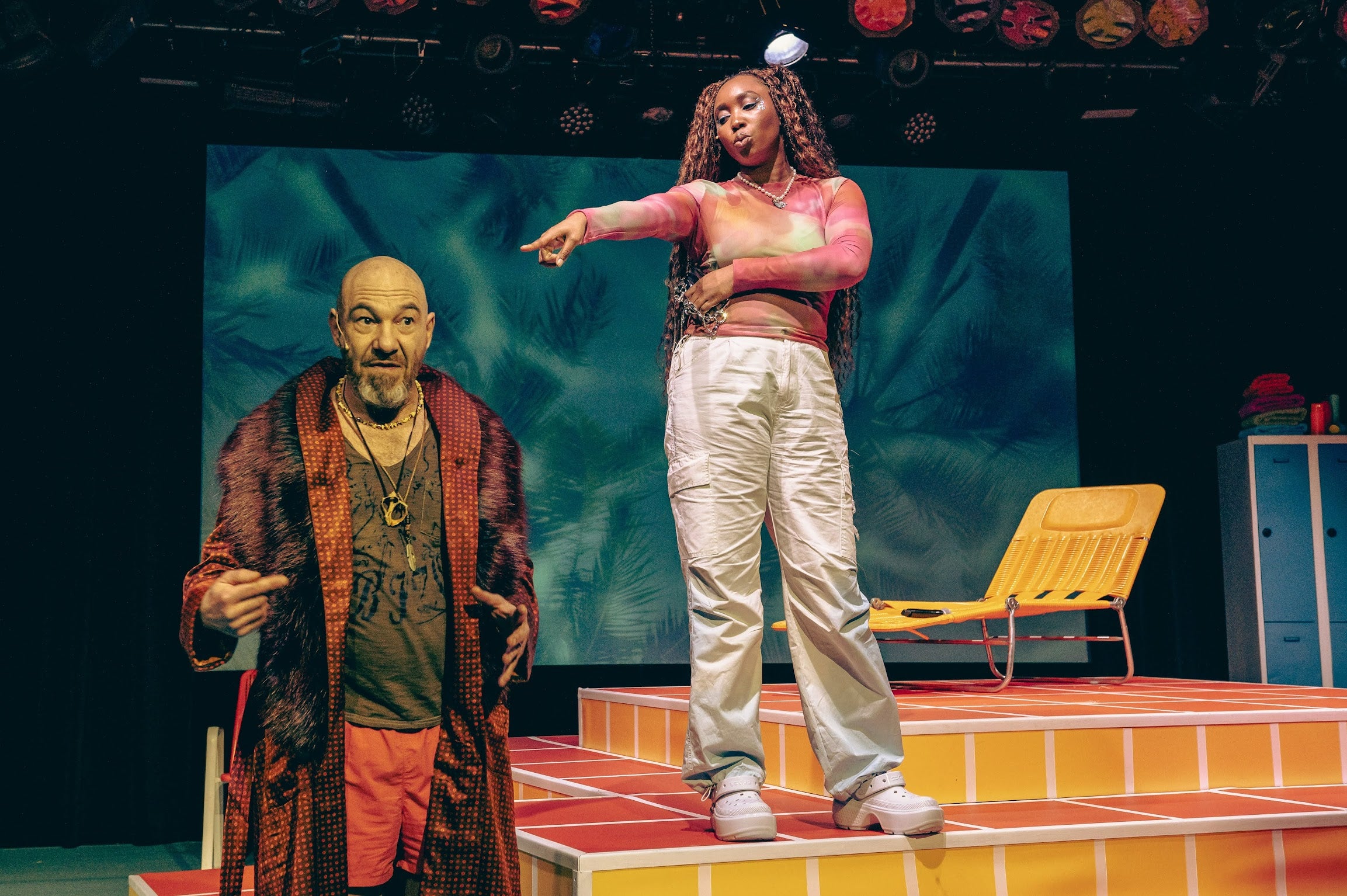 Doch die hat längst ihr Herz verloren. An den selbstverliebten Influencer Artur (Raphael Rameis), der bei ihr mit rassistischem Macho-Gehabe („Fuck ist die geil. Ich Weltenbürger. Du sprechen meine Sprache?“) die Schmetterlinge im Bauch weckt. Eine vermeintlich verbotene Liebe, die bei Papa Abendwind, dem Häuptling der Kannibalen, nur Hungergefühle auslöst: „Haben sie schon einmal eine Menschen gegessen? Einen keuchenden Lungenbraten von einem Kettenraucher? Eine geröstete Leber von einem Trankler? Das ist bei uns halt Tradition.“