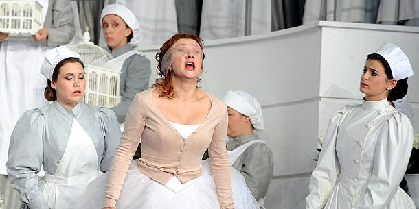 Zuvor Iolantha von Tschaikowsky. Eine Blinde, die geheilt wird durch die Zuneigung eines Mannes, der ihr die täglichen Schönheiten sichtbar macht. Spielt im 15. Jahrhundert, in einem zauberhaften Garten. Hier, im Theater an der Wien, in einer weißen, sterilen Mini-Architektur. Die Gefährtinnen der Iolanta sind Dutzende Krankenschwestern. Wer aufmerksam die Musik dieser beiden Meisterwerke hört, assoziiert mit ihr ganz andere intensive Bilder.