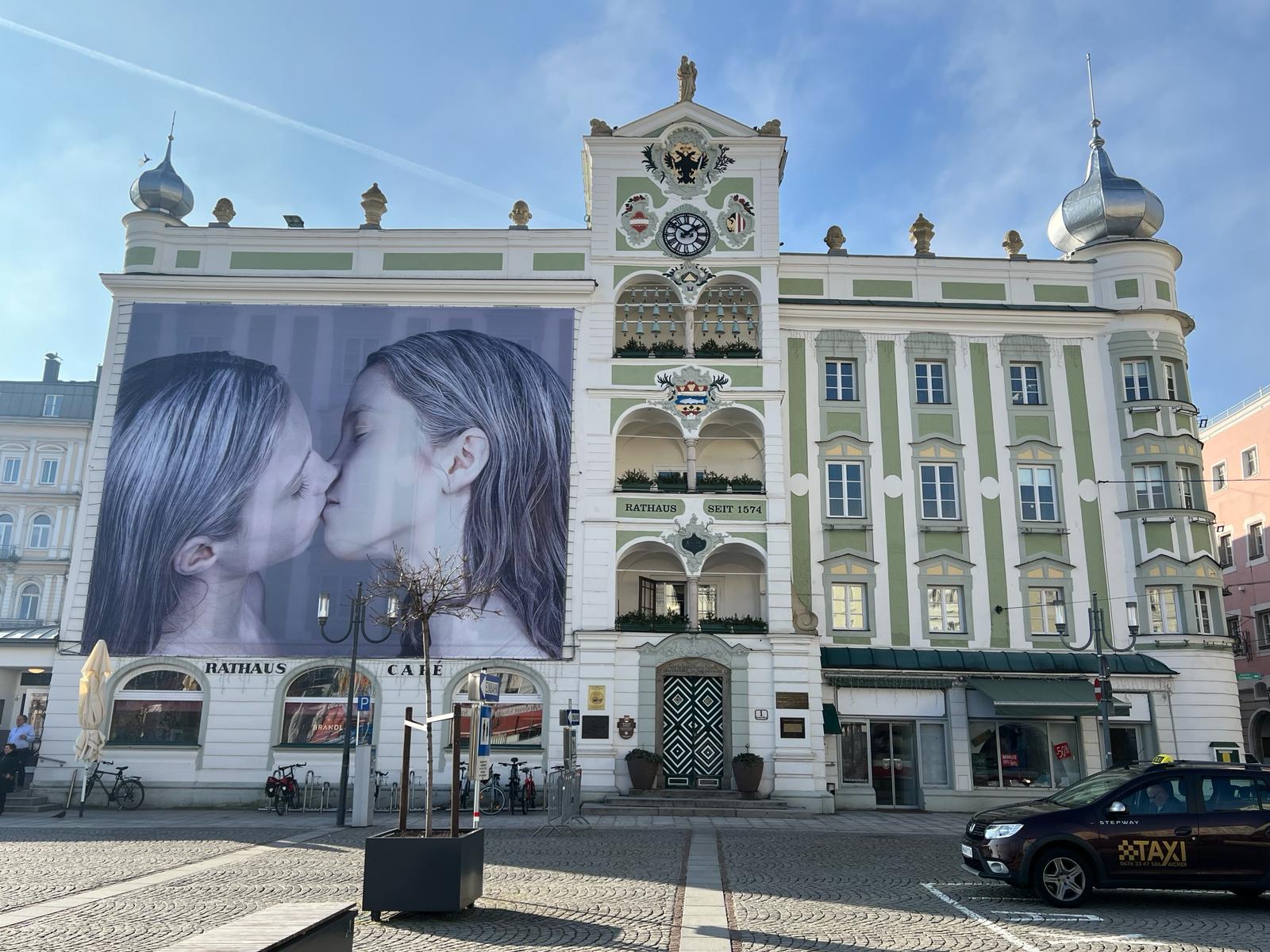 Gottfried Helnwein hat das Rathaus und das Stadttheater in Gmunden im Kulturhauptstadtjahr Salzkammergut 2024 mit übergroßen Bildern verhängt.
