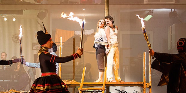 KRITIK. Dass das Libretto der Perlenfischer blöd ist, wussten die Textdichter Cormon und Carré selbst. Trotzdem hat der 25-jährige Georges Bizet wunderbare Musik geschrieben. Die in Ceylon spielende Geschichte von den Freunden Nadir und Zurga, die in die Tempelpriesterin Leila verliebt sind, hat die junge Holländerin Lotte de Beer dazu inspiriert, das Stück als TV-Reality-Show im Dschungelcamp zu inszenieren. Regisseur, Moderator und Kameramänner besiedeln die Bühne, im Hintergrund sitzen die Choristen vor dem Fernseher und stimmen über Tod und Leben der Kombattanten ab.