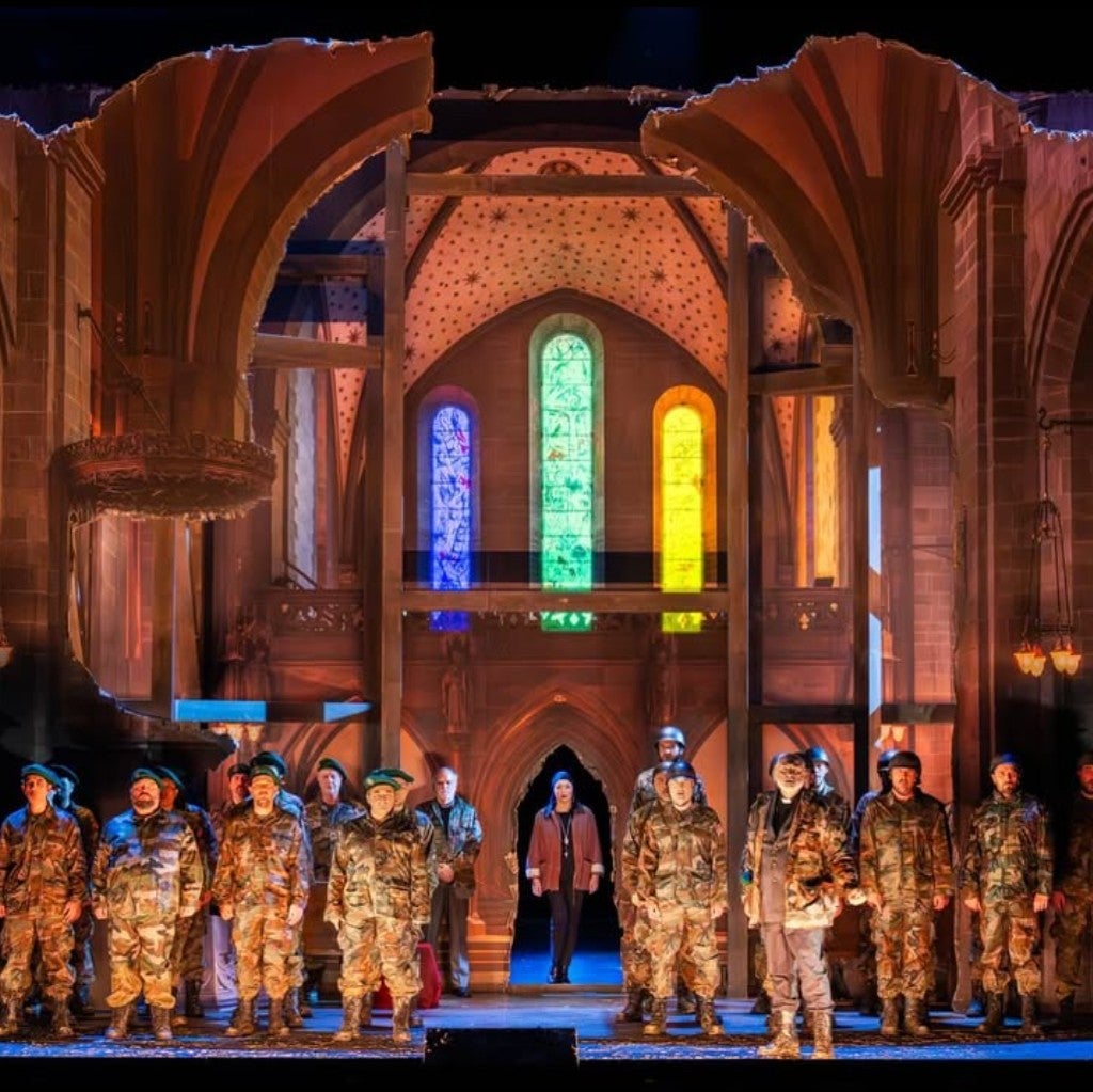 Regisseurin Valentina Carrasco präsentiert die Oper als modernes Kriegsdrama mitten in der Alpenrepublik. Schon zu Beginn verwandelt sich das Opernhaus in einen fiktiven Kinosaal: Explosionen, Nachrichtenbilder und Drohnenangriffe auf Zürich werden eingeblendet. Die Bühne zeigt eine "Investmentbank" mit der Aufschrift "Zürich", Schauplätze wie die UNO in Genf oder das Davoser Kongresszentrum erscheinen im Verlauf des Stücks. Mit 3D-Soundeffekten, Militäruniformen und Schweizerdeutschem Gemurmel entsteht ein beklemmendes Szenario.