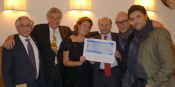 Im Bild: rechts außen der Tenor Massimo Giordano, daneben der Bariton Marco Vratogna; links Aki Nuredini, daneben Günter Rhomberg, Gabriele Werner und Dir. Meyer