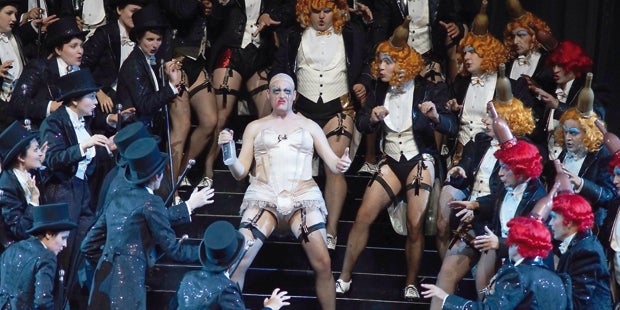 Herheim siedelt Offenbachs Meisterwerk über den liebes- und trunksüchtigen Dichter Hoffmann auf und unter einer von allerlei choristischen Transvestiten und Freudschen Doppelgängern besiedelten drehbaren Showtreppe an, die bei der Premiere am Donnerstag just während Hoffmanns chromatisch aufsteigender Ballade vom grotesken Zwerg Klein-Zach kurz den Geist aufgab.