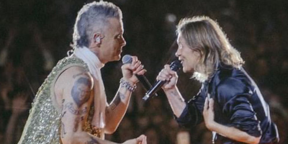 1995 stieg er bei Take That aus. 2010 kehrte für die CD „Progress“ und eine 35 Konzerte umfassende und 180 Millionen Dollar lukrierende Europa-Tournee kurzfristig wieder zurück, um sich mit Take The Crown (2012) doch weiter der Solo-Karriere zu widmen. Jetzt rockte Robbie Williams endlich wieder mit seinem Take-That-Kumpel Mark Owen. Überraschungs-Duett in England.