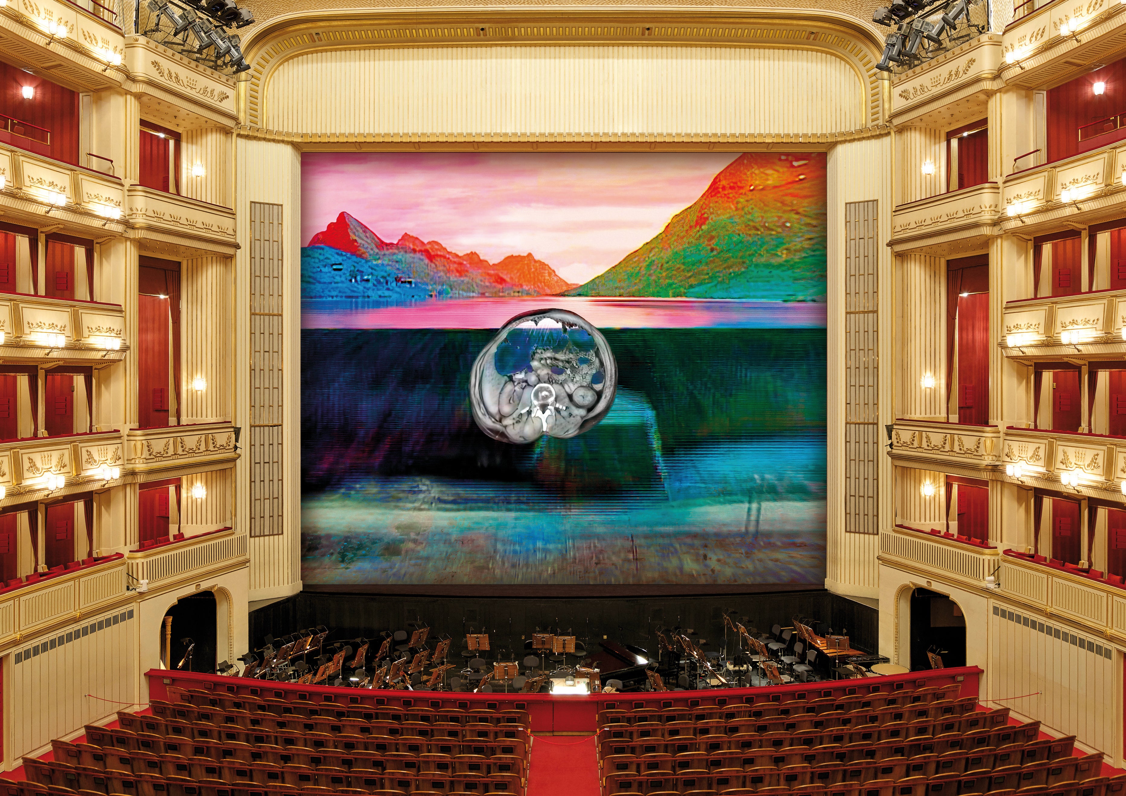 Seit 1998 verwandelt die Wiener Staatsoper ihren „Eisernen Vorhang" in einen Ausstellungsraum zeitgenössischer Kunst. Nacht dem Großraumbild „Solaris“ von Ansel Kiefer ziert nun das 176 Quadratmeter große Werk »Bauchhöhle überfliegt Staumauer« der Schweizer Künstlerin Pipilotti Rist die bereits 27. Ausgabe der Ausstellungsreihe, die bis Ende Juni 2025 vom Publikum vor und nach den Aufführungen sowie in den Pausen wahrgenommen werden kann.