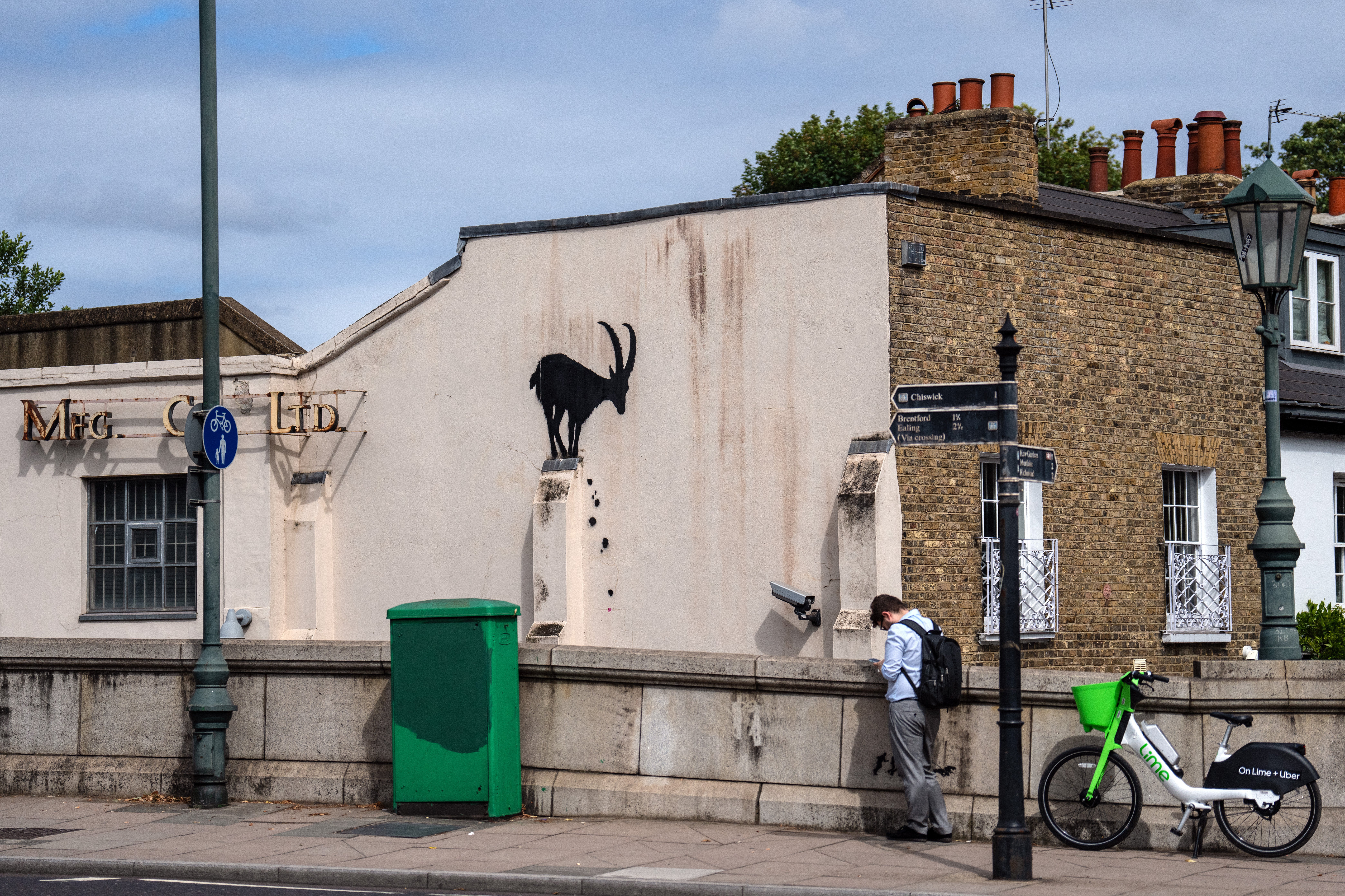 Auf einem davon ist ein Steinbock zu sehen, der scheinbar auf dem Strebepfeiler an einer Hauswand balanciert und dabei Steine ins Rollen bringt. Eine echte Überwachungskamera ist auf die Szene gerichtet. Sie wurde später von Mitarbeitern einer Sicherheitsfirma wieder auf die Straße ausgerichtet, wie auf Bildern der Nachrichtenagentur PA zu sehen war.