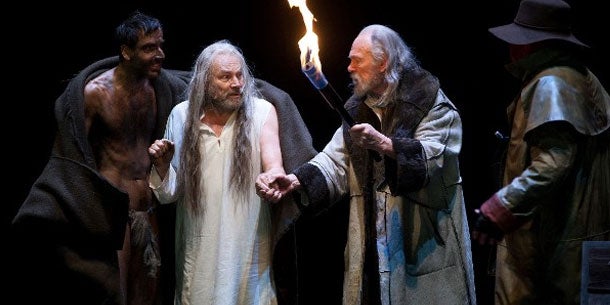 Peter Steins Sicht auf das große, pessimistische Shakespeare-Drama benutzt keine Aufheller. Was unter und hinter einem von Ferdinand Wögerbauer geschaffenen hohen, steinernen Bühnenportal auf weitgehend leerer Bühne vor sich geht, ist düster und wird auch nur spärlich beleuchtet. Die wilden Horden des greisen Königs sind mit Fellen angetan, eine Bande gefährlicher Waldschrate, die ihre erlegte Beute mit sich schleppt. Doch nur äußerlich geben sich Goneril und ihr Gefolge (in dunklem Grün) sowie Schwester Regan und ihr Hofstaat (in Weinrot) kultivierter. In Wahrheit schält die Entscheidung des Königs, seine Macht bereits zu Lebzeiten abzugeben und sein Reich unter seinen drei Töchtern aufzuteilen, langsam den Kern der Menschen heraus - und der ist bei vielen verdorben und verfault.
