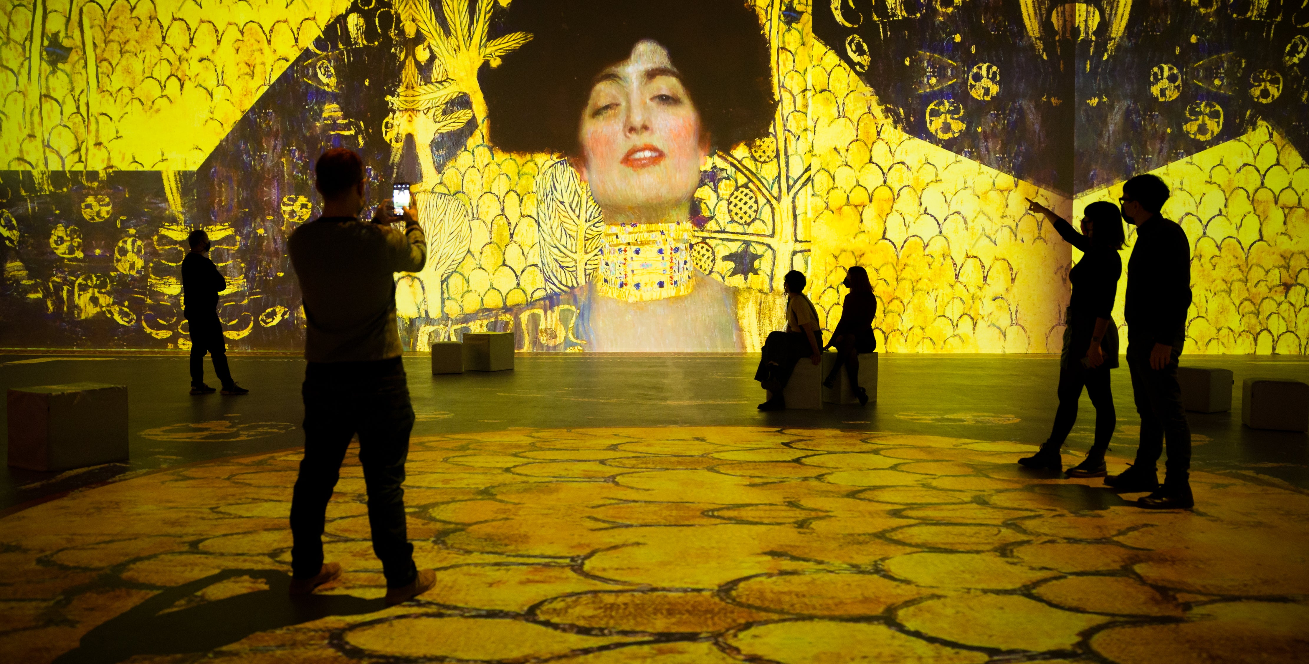 Die multimediale Lichtinstallation bringt die geballte Farbenpracht von Klimts Werken zur Geltung und macht Kunst für den Betrachter in einer immersiven Erfahrung greifbarer als je zuvor. Die Gemälde und Gebäude, an denen Klimt gearbeitet hat, werden mit Hilfe von übergroßen und mehrdimensionalen Projektionen und Videoanimationen zum Leben erweckt. So bleibt dem Besucher kein Detail der berühmten Kunstwerke verborgen. Klimts Schöpfungen wie „Goldene Adele“, „Judith und Holoferness“, das „Beethovenfries“ und natürlich sein Meisterwerk „Der Kuss“ werden aus einer ganz neuen Perspektive erlebbar.