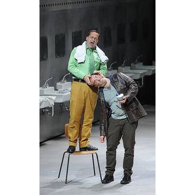 Niermeyers Sicht ist kühler, Wozzeck befindet sich als ein Proband unter vielen in einer Anstalt (Bühne: Stefanie Seitz). Serielles Rasieren, Urinieren in Plastiksackerl und der Genuss von abscheulichen Flüssigkeiten bestimmt den Alltag der Insassen. Wozzeck selbst scheint da noch der Klarsichtigste, der britische Bariton Leigh Melrose verleiht diesem Getriebenen präzise darstellerische Gestalt und stimmliche Prägnanz. Der wahre Wahn, den verkörpern der Doktor (geradezu buffonesk: Graeme Danby) und der von Kostümschneiderin Kirsten Dephoff in eine knallbunte Uniform gezwängte Hauptmann (Dietmar Kerschbaum steigerte sich nach verhaltenem Beginn). Ihre Anfälle entwickelt Niermeyer jedoch stets aus der Musik, bis zuletzt wirkt diese Binnenatmosphäre konsequent und nachvollziehbar. Stimmig ist auch der Regiekniff, Wozzecks Kind als Beobachter dieses wahnwitzigen Treibens zu installieren.