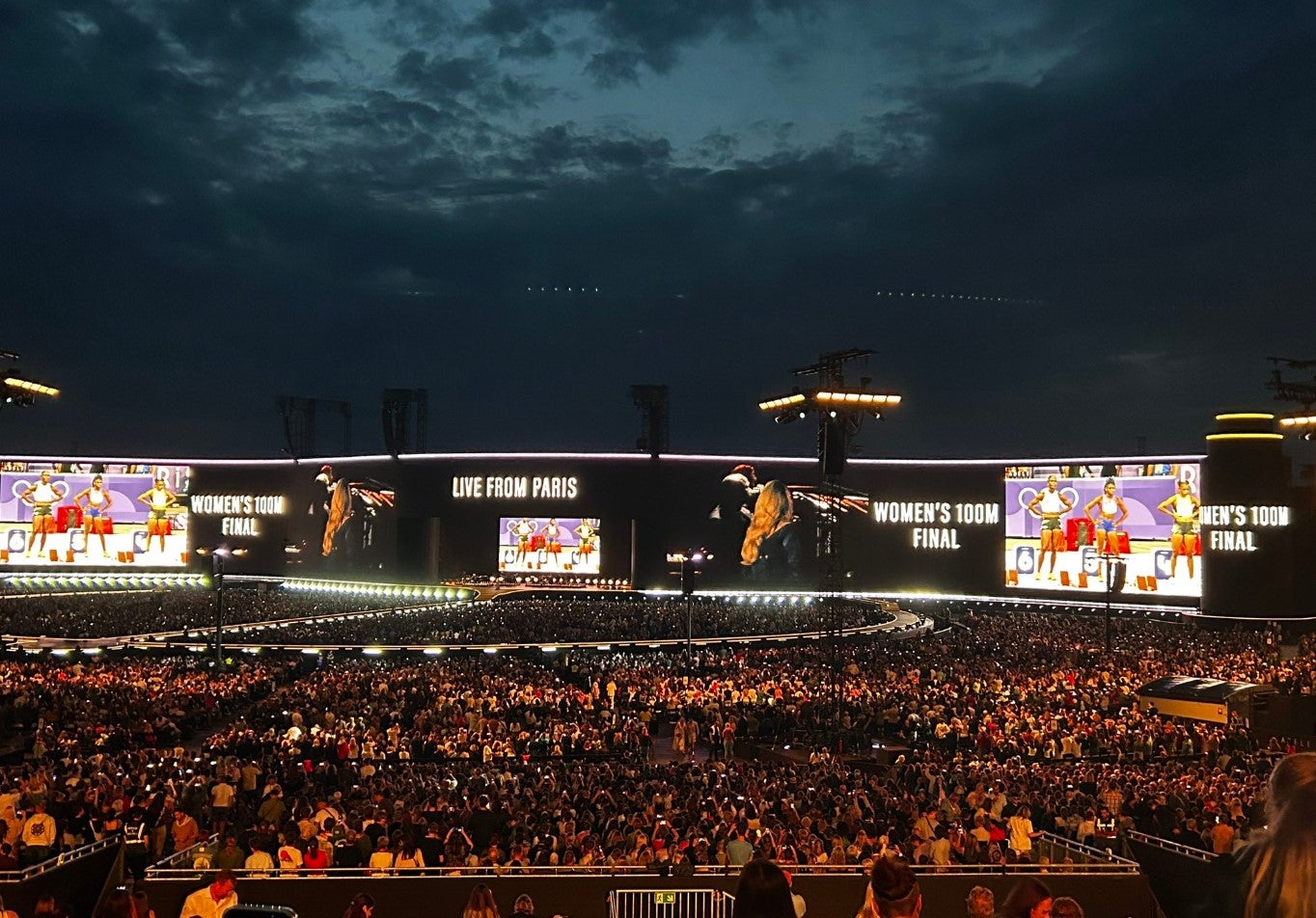 Auf der beeindruckenden Bühne, auf der sich eine riesige Videoleinwand befindet, erschien plötzlich die Aufschrift „Live from Paris“. Die Fans sahen nun nicht Adele, sondern das spannende 100-Meter-Finale der Frauen bei den Olympischen Spielen, das gleichzeitig in Paris stattfand.