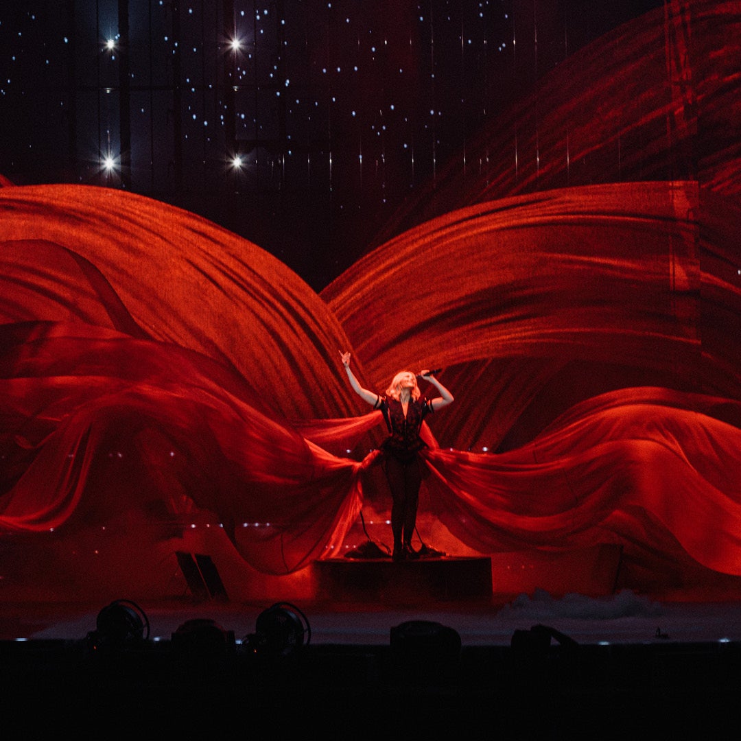 Einzige Ausnahme ist ein 112 Meter langes, die ganze Bühnenbreite umspannendes rotes, feuerfestes Windkleid. Das wird ihr beim Hit „ „Volle Kraft voraus“ wie von Zauberhand nach und nach angelegt. Wow-Effekt!