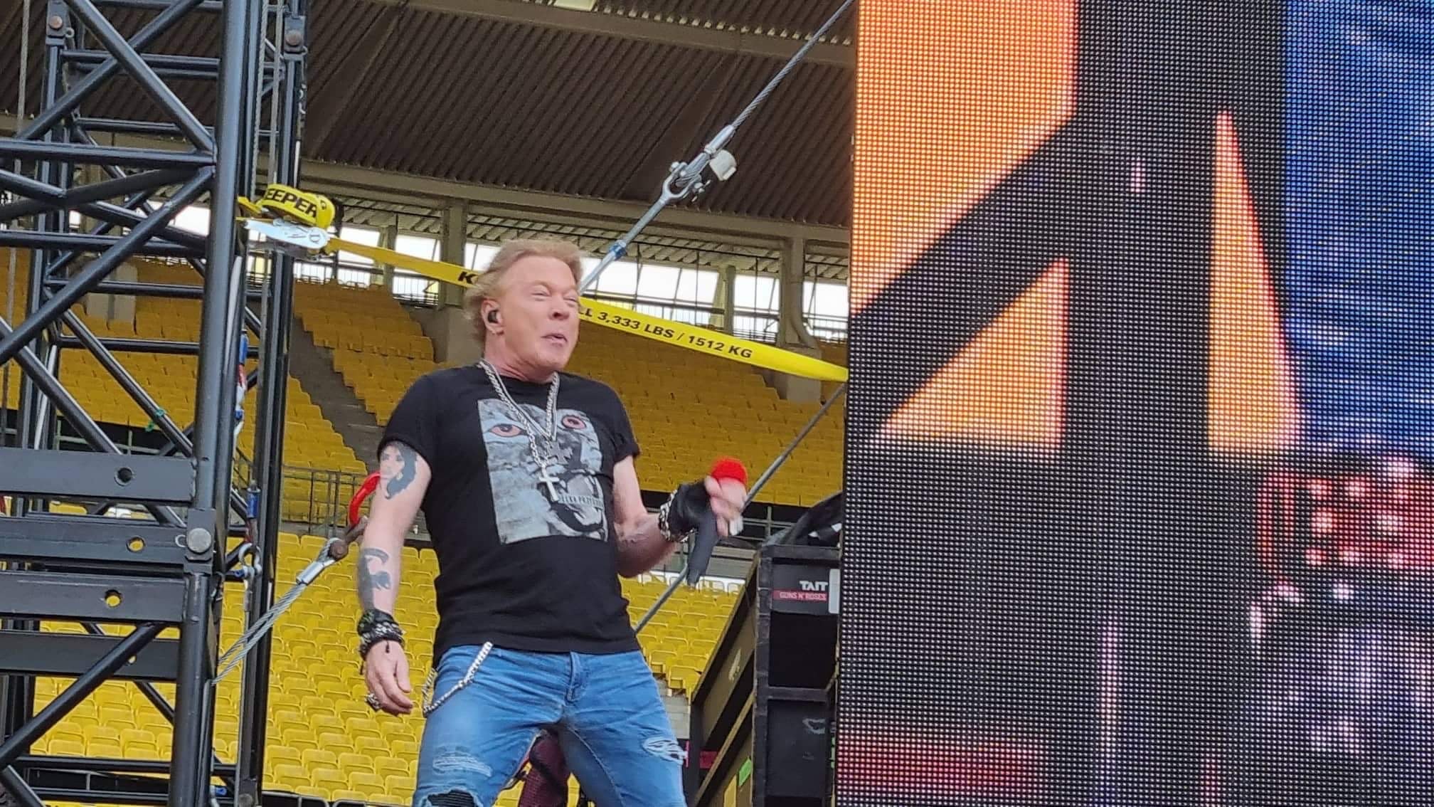 Die etwas gar optimistische Beginnzeit von 19.15 Uhr wurde nicht ganz eingehalten. Auch weil Guns N‘ Roses noch gemütlich bis 19 Uhr (!) im Hyatt Hotel relaxten. Aber bereits um 19.28 Uhr, also so früh wie noch nie für einen Headliner in Wien, startete Axl Rose gestern im Happel-Stadion mit dem 1987er Klassiker It’s So Easy sein Höllen-Feuer. 40.000 Fans, die seit der Absage in Glasgow (5. Juli) um das Wien-Konzert gezittert haben, in voller Euphorie. Die Stimm-Probleme waren zwar anfangs noch hörbar, aber der Elan zurück. Auch der legendäre Schlangentanz.