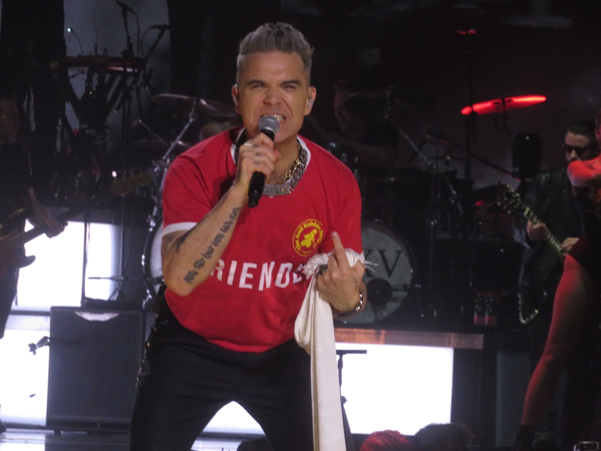 Zwischen ewigen Mitsing-Hits wie Strong, Come Undone oder Feel fand er auch offene Worte über Absturz, Drogen und Depression: „Ich war 70 Mal in Therapie!“ Aber auch über seine neue gefundene Lebensfreude durch Ayda, die im Publikum mitschunkelte, und die Kinder: „Es schaut so aus, als gäbe es ein Happy End für mich: Das Leben ist gut!“