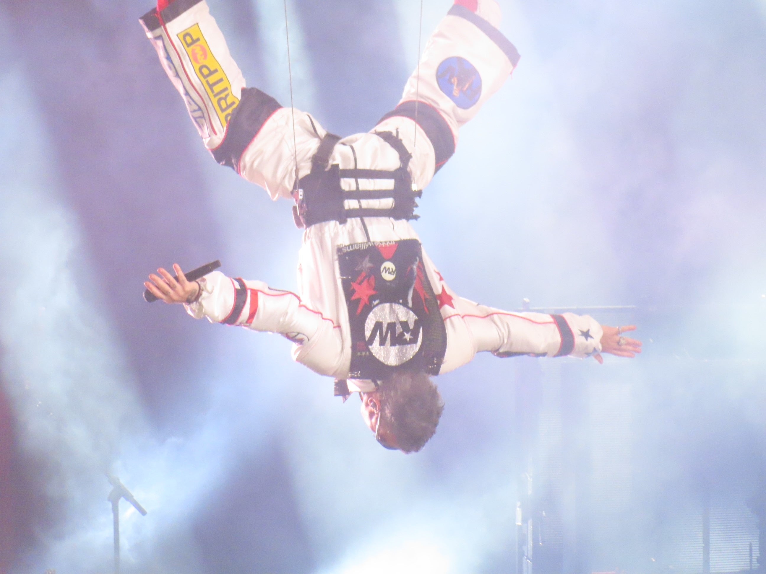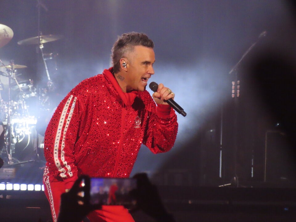 „Ihr seid die Show. Ansonsten ist es nur ein Typ mit psychischen Problemen, der durch das Stadion hüpft,“ ließ er das begeisterte Publikum wissen, um mit einem flotten Hi-Tech Bombast-Spektakel das Gegenteil zu beweisen: Mit Bungeesprung, Konfetti-Fontänen, überdimensionalen Feuer-Flügeln und KI-Zwiegesprächen mit seinem 17-jährigen bzw. 80-jährigen Ich („Ist dein Penis noch immer so klein?“) setzte Robbie am Wörthersee auf einen emotionalen Mix aus Hits, knackigen Sprüchen („Mein Name ist Robbie fucking Williams. Und das ist mein Hintern“), Modeschau (gleich 5 flippige Kostüme) und Herz: „Meine Mum hat Demenz und erkennt mich nicht mehr. Mein Daddy hat Parkinson und konnte 2 Jahre lang das Haus nicht mehr verlassen, aber kürzlich schaute er bei einem meiner Konzerte vorbei. Einer der schönsten Tage meines Lebens!“ Ein Stein, wer da nicht mit den Tränen kämpfte.
