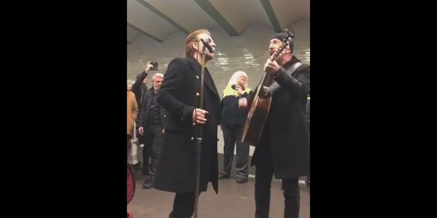 Ein Konzert der völlig anderen Art gab U2 am Mittwoch in Berlin. Anstatt wie gewöhnlich vor Zehntausenden Fans abzurocken spielte Bono Vox mit seinen Bandkollegen in der U-Bahn-Station "Deutsche Oper" auf.