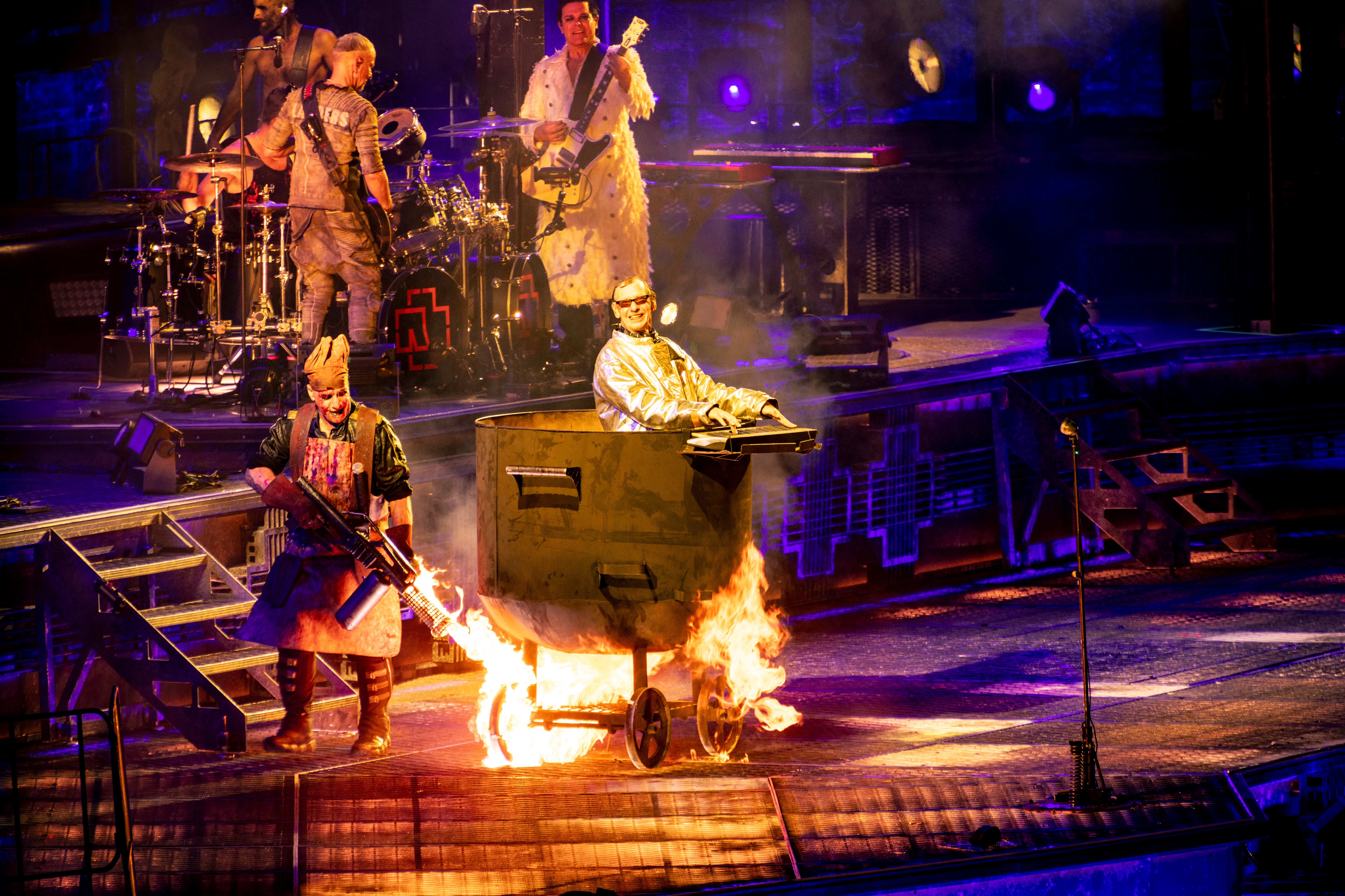 Zu 21 Mitstampf-Hymnen wie „Links 2 3 4“, „Asche zu Asche“ oder "Sonne" wurden gleich jeden Abend gleich 1.000 Liter Testbenzin abgefackelt. Auch in Richtung eigener Band-Mitglieder. Till Lindemann, nach den vielen Vorwürfen ja von der Staatsanwaltschaft frei gesprochen und somit rehabilitiert, heizte eine überdimensionalen Kannibalen-Kochtopf an in dem Keyboarder Christian Lorenz saß.