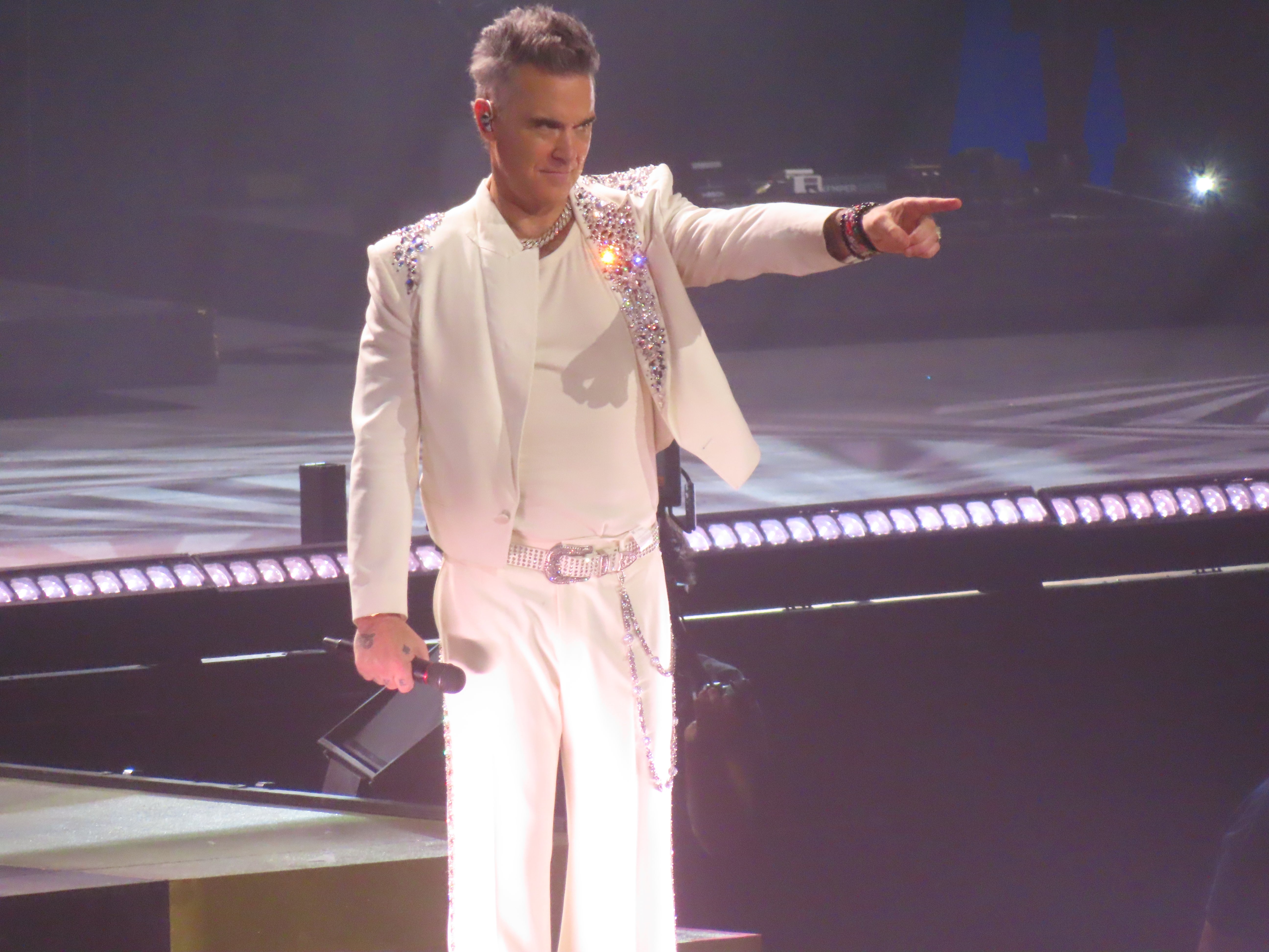 Vom Opener „Rocket“, dem einzigen Vorboten der für 10. Oktober erwarteten CD „Britpop“, bis zum von Handylichtermeer begleiteten Gänsehautfinale „Angels“ setzt Robbie bei seinem „Heimspiel“ auf sein fast 30 Jahre erprobtes Erfolgs-Konzept: Enter-Motherfucking-tainment! Mit bewährten Sprüchen („Mein Name ist Robbie fucking Williams. Und das ist mein Hintern.“), einem fanfreundlichen Best of-Programm, mitsingfreudigen Coverversionen wie „Living On A Prayer“ von Bon Jovi und erfrischend viel Publikumsnähe: „Ihr seid die Show! Ohne euch wäre da nur ein Typ mit psychischen Problemen, der durch das Stadion hüpft!“