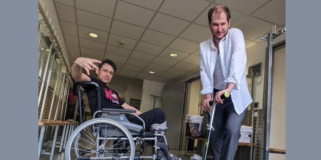 Gitarrist Manuel Poppe sitzt nach einem Unfall im Rollstuhl - das rechte Bein in eine Schiene gepackt. ''Live Forever'' postete man in Anlehnung an Oasis dazu.