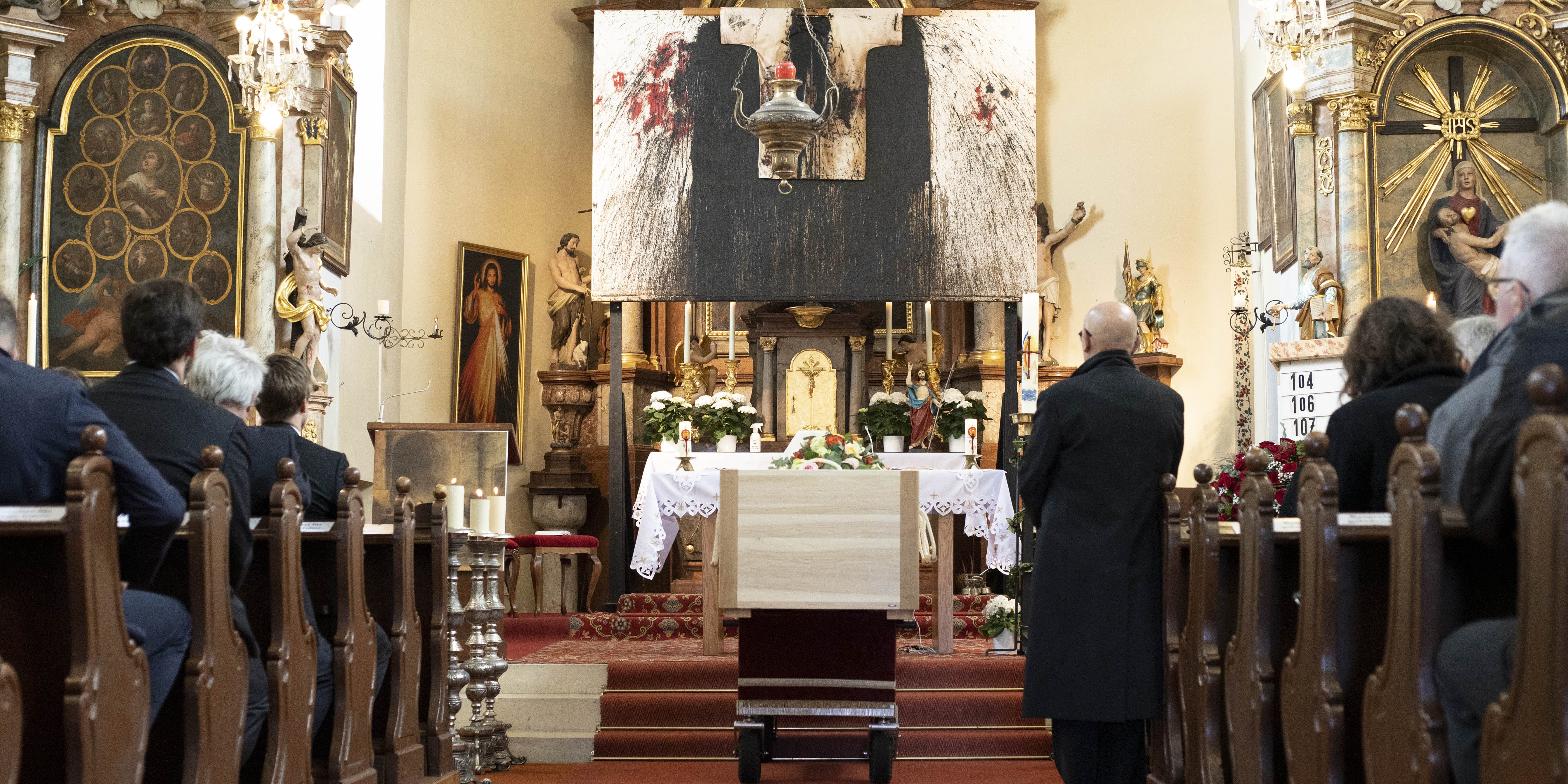 Wien/Prinzendorf. Der am 18. April gestorbene Aktionskünstler Hermann Nitsch ist heute, Samstag, Nachmittag zu Grabe getragen worden. Pater Friedhelm Mennekes zelebrierte in der Kirche von Prinzendorf die Totenmesse auf Latein. Der Altar war mit einem Schüttbild des weltberühmten Künstlers geschmückt, Nitsch selbst in einem schlichten Holzsarg davor aufgebahrt. Unter den zahlreichen Gebinden befanden sich auch Kränze des Bundespräsidenten sowie der Niederösterreichischen Landeshauptfrau.