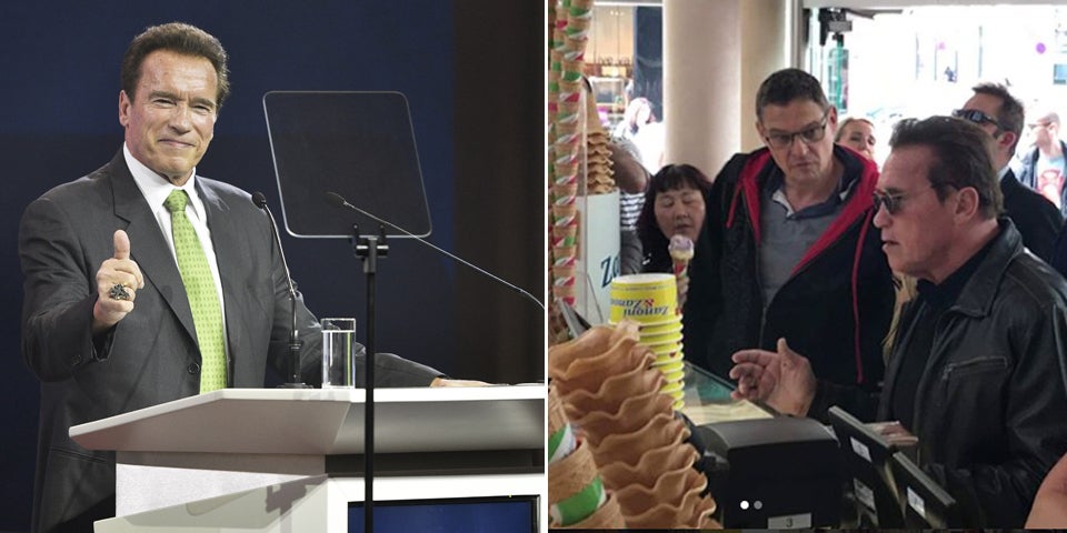 So gönnte er sich ein Zanoni-Eis beim Lugeck, wo die überraschten Mitarbeiter des Salons Fotos und Videos machten. Zwei Sorten dürfte Arnie genossen haben, wie es auf den bewegten Bildern aussieht - Vanille und Schoko vielleicht.
