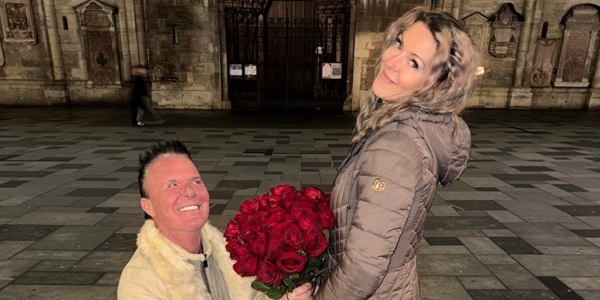Marcus von Anhalt kniete mit einem Strauß Rosen vor Simone - im Hintergrund der Stephansdom.