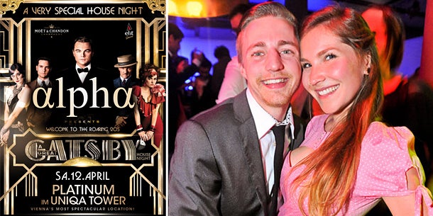 Unter dem Motto "A Great Gatsby House Night" lädt der Club Alpha am 12. April zu einer einzigartigen Nacht voll Glanz und Glamour. Zu den besten House Tunes kann hier in der glänzenden Kulisse der 20er Jahre bis in die Morgenstunden gefeiert werden: große Ballons, crazy Dancers, Lichterketten, Schokoladebrunnen, 20s Visuals und vieles, vieles mehr erwarten hier alle Gäste.