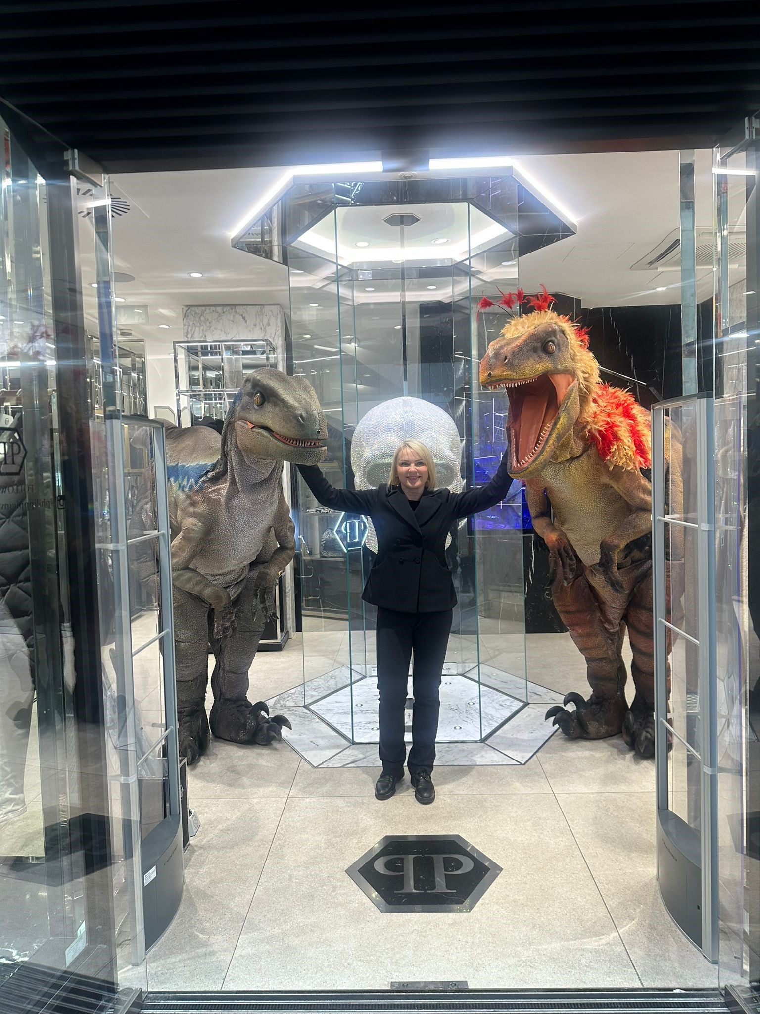 Unter anderem fühlten sich die Giganten vom Glitzer im Philipp Plein-Store in der Wiener Goldschmiedgasse magisch angezogen. Sehr zur Freude der Besitzer Manuela und Ernst Fischer. Dabei bewies vor allem Frau Fischer ein wahres Talent als Dino-Dompteuse und steckte mutig ihren Kopf in das Maul mit dem Riesenzähnen.