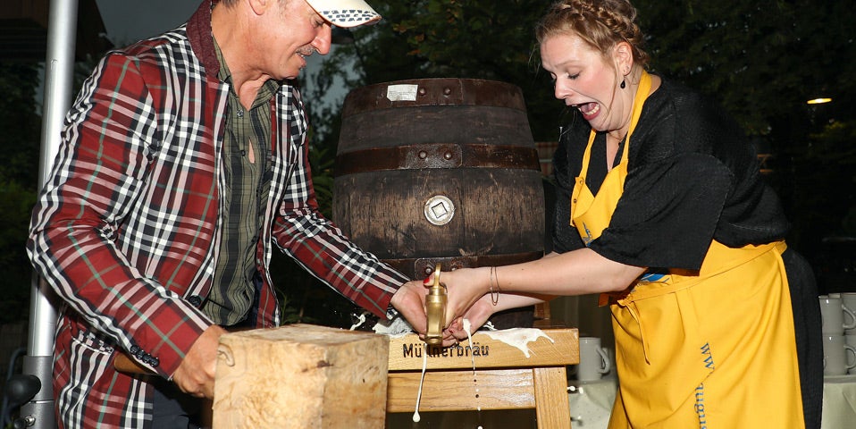Beim inoffiziellen Auftakt der Salzburger Festspiele, dem Künstlerfest im Garten des urigen Krimplstätterwirtes, zeigte Schauspieler Tobias Moretti, dass er sich auch mit Bier gut auskennt. Beim traditionellen Bieranstich, den Jedermann und Buhlschaft gemeinsam übernehmen, schlug er kräftig zu und versprühte fast keinen Tropfen Bier.