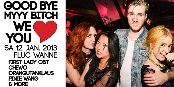 Beim allerletzten MBC am 12. Jänner in der Fluc Wanne werden langjährige DJ-Gefährten wie First Lady OBT, Chewo und Orangutanklaus bis 6 Uhr früh Abschiedsständchen spielen. Zeigt noch einmal Eure Liebe! Die Myyy Bitch Veranstalter bitten um Herzen - ob auf T-Shirts, aufgemalt oder selbstgebastelt. An den Turntables des Clubs rocken u.a. First Lady Obt, Chewo, Orangutanklaus, Pinie Wang und viele mehr.