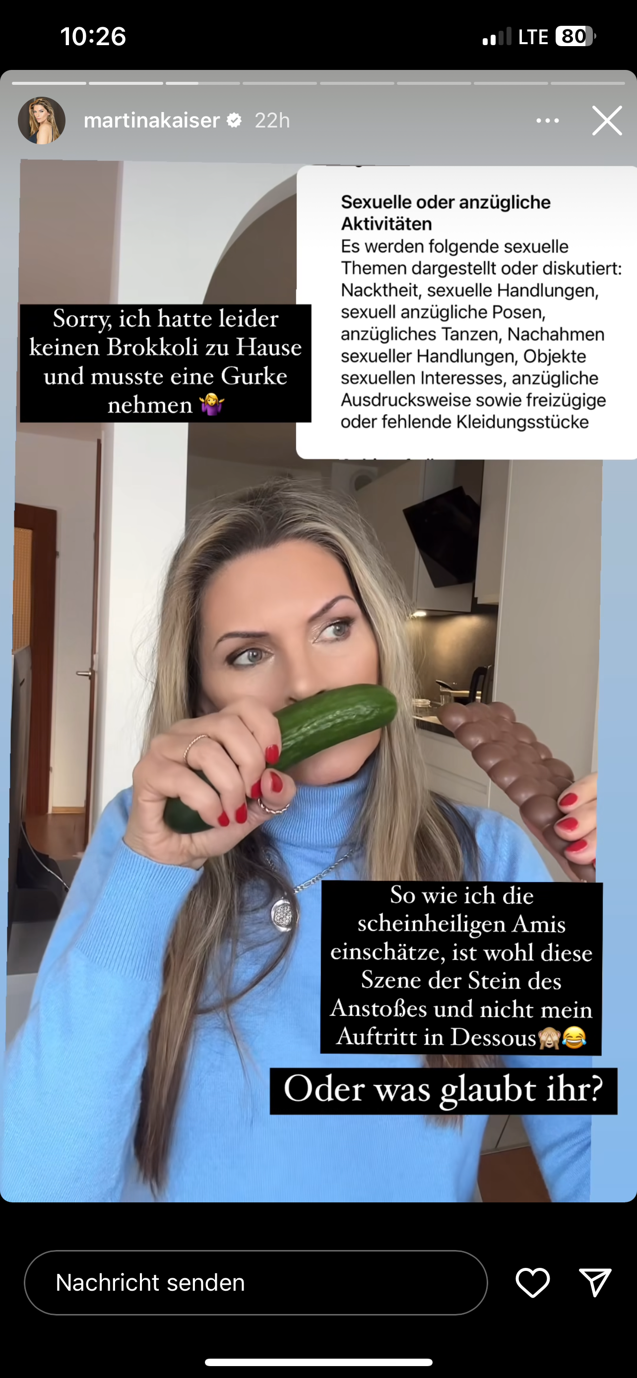 Auch nach ihrem ORF-Aus gibt es noch viel von Martina Kaiser zu sehen. Zu viel, wenn es nach manchen Instagram-Usern geht. Denn ein Video, das sie zeigt, wie sie an einer Gurke riecht, soll jetzt gegen die Richtlinien verstoßen haben, da es sexuelle Aktivitäten offenbare. "Ich versuche gerade meinen Instagram-Account zu monetarisieren. Leider wurde mein erfolgreiches 'Ich bin Martina Kaiser'-Video abgelehnt weil es gegen die Regeln verstößt", erklärt sie.