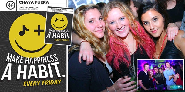 „Happiness“ lautet das Motto jeden Freitag im Chaya Fuera in der Kandlgasse 21, in 1070 Wien. Chaya steht für „Leben“. Fuera beschreibt das „Draußen“. Woche für Woche kann man einen Abend voll feuriger Livemusik und toller Stimmung genießen. Diesen Freitag kann sich außerdem jeder Besucher unter dem Motto „Make Someone Smile“, sein eigenes, ganz persönliches T-Shirt kreiren lassen.
