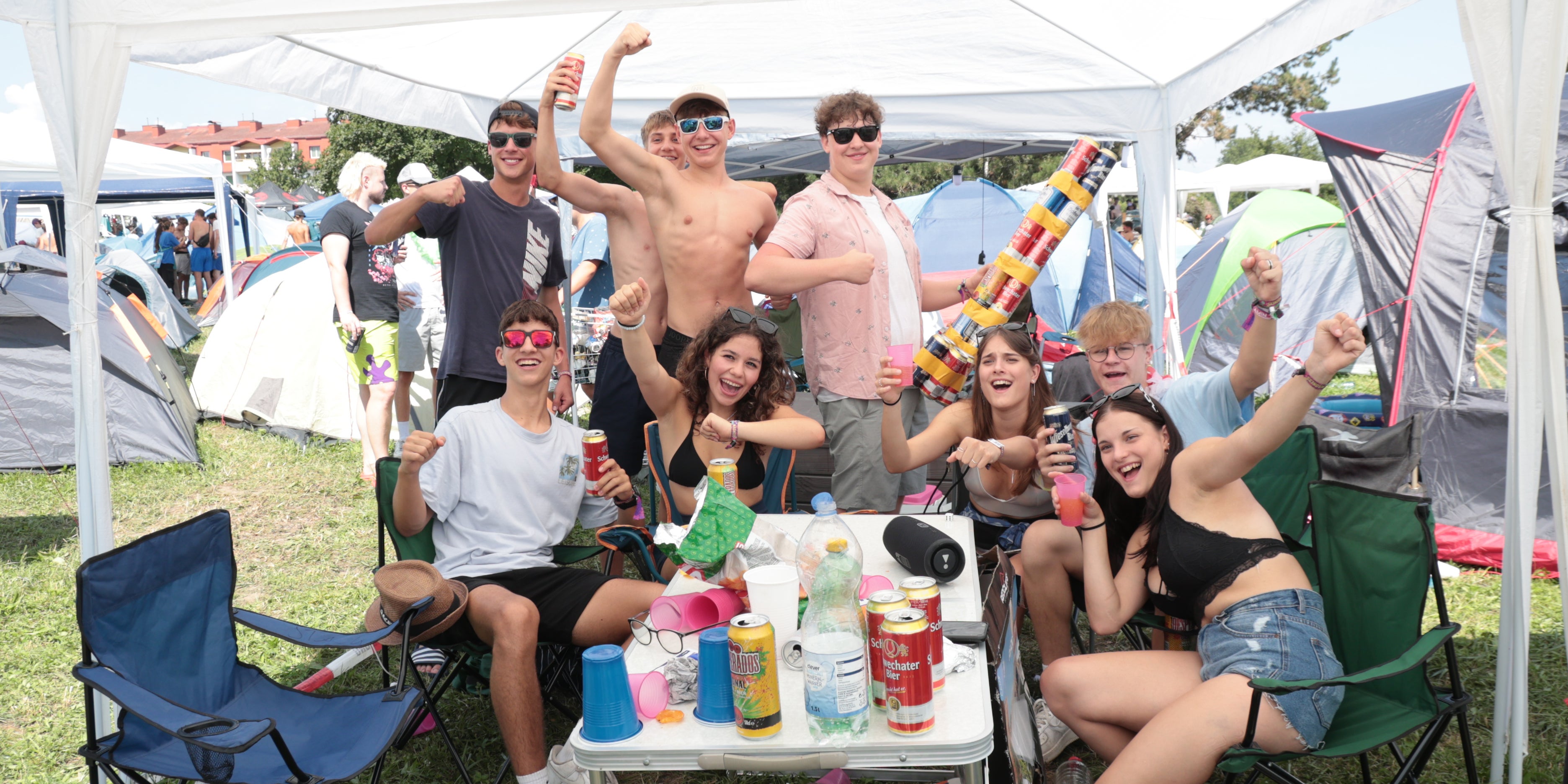 Die Lage auf den Campinggelände, das schon am Dienstag gegen einen Aufpreis von 25 bzw. 45 Euro (Caravan) geöffnet wurde und den Parkplätzen war trotzdem etwas chaotisch: Unzählige Besucher mussten stundenlang nach einem freien Platz für ihr Zelt suchen. Der Frust wurde aber bald mit Bier (6,50 Euro!) und Baden in der nahen Traisen ertränkt. Bei 30 Grad eine mehr als willkommene Erfrischung. Viele wollten gar nicht mehr aus dem Wasser.