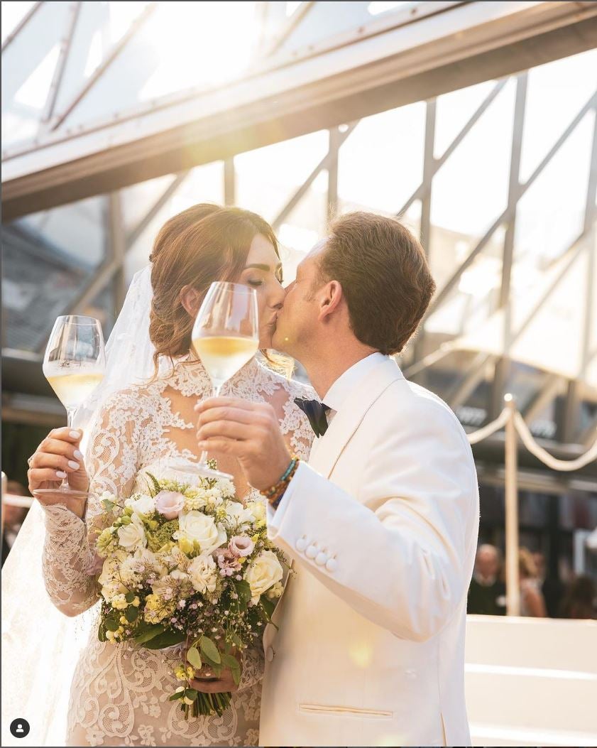 "Sie hat Ja gesagt. Es ist der glücklichste Moment meines Lebens", postete Riedel auf Instagram zusammen mit Bildern seiner Traumhochzeit. Bei der Feier wurde edler Rotwein aus einem eigens für die Hochzeit gefertigten Dekanter, der die Gesichter des Brautpaars eingraviert hat, getrunken.