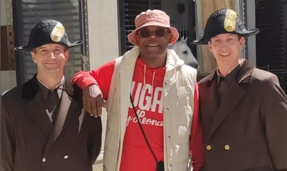 Samuel L. Jackson strahlte mit pinkem Bucket-Hut und Hoodie