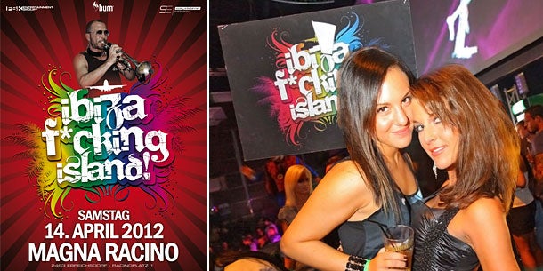 Knapp 1 Monat vor den legendären Opening Parties, geht die Partyinsel Ibiza auf Tour und bringt dabei ihren einzigartigen Spirit direkt nach Österreich – ins Magna Racino in Ebreichsdorf. Die Magie der kleinen Baleareninsel zieht Jahr für Jahr abertausende Partyhungrige in ihren Bann und mit ihnen die weltbesten DJ´s und Performer. FSK Entertainment Group & Society Entertainment präsentieren am Samstag den 14. April 2012 mit "Ibiza F*cking Island" ihr zurzeit angesagtestes Eventlabel und bietet dabei eine explosive Nacht voller Highlights.