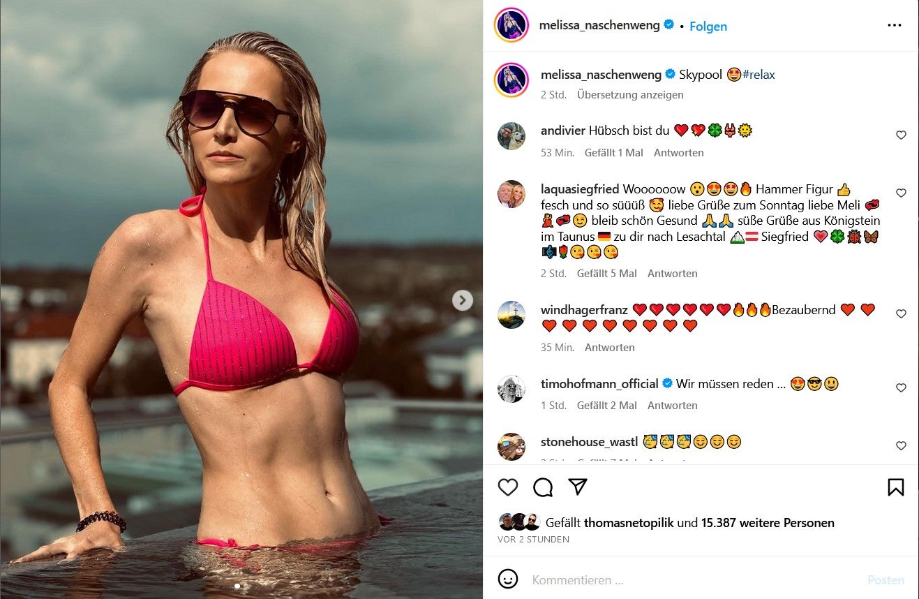 Pinker Bikini, Sonnenbrille und sexy Pose - Schlagersängerin Melissa Naschenweng sorgt auf Instagram für schweißtreibende Momente. "Skypool" schreibt die fesche Kärntnerin dazu. Wo genau sie gerade urlaubt und ob ihr Liebster, Toni Gabalier die Bilder gemacht hat, verrät sie in ihrem Posting nicht.