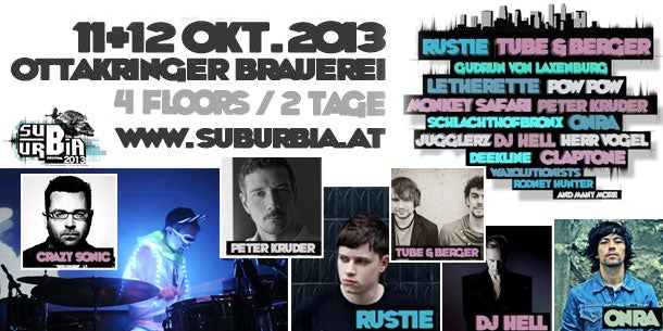 Das Suburbia Festival geht am 11. und 12. Oktober in der Ottakringer Brauerei über die Bühne. Die Erstausgabe des zweitägigen Festivals bietet zahlreiche Headliner verschiedenster Stilrichtungen. Auf 4 Floors lässt die Veranstaltung Freitag und Samstag urbane Partykultur, Visuals, Street Art und Mode verschmelzen. Es spielen Acts wie Rustie, ONRA, Letherette, Schlachthofbronx, Gudrun von Laxenburg, Tube & Berger,Claptone, Monkey Safari - und einige mehr.