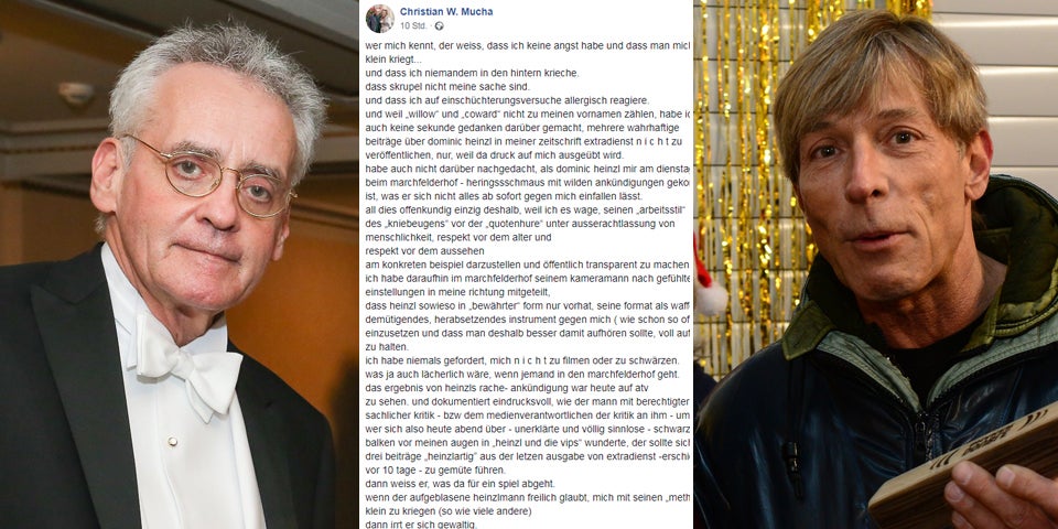 Verleger Christian W. Mucha und Society-Reporter Dominic Heinzl im Schlagabtausch: Mucha hat in seiner letzten Ausgabe von "Extradienst" drei Beiträge unter dem Titel "Heinzlartig" über Heinzls Berichterstattung veröffentlicht.