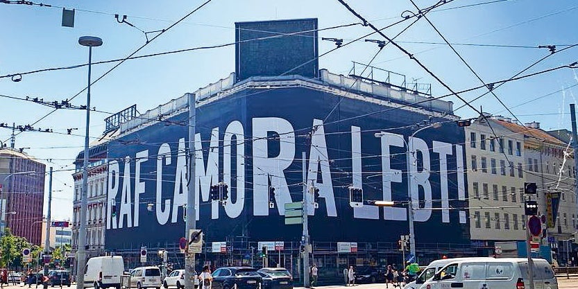 Wien. Wer zurzeit beim Westbahnhof unterwegs ist, dem wird unweigerlich das riesige Plakat auf dem Gebäude neben dem Bahnhofsgebäude auffallen. Darauf zu lesen: „RAF Camora lebt!“.