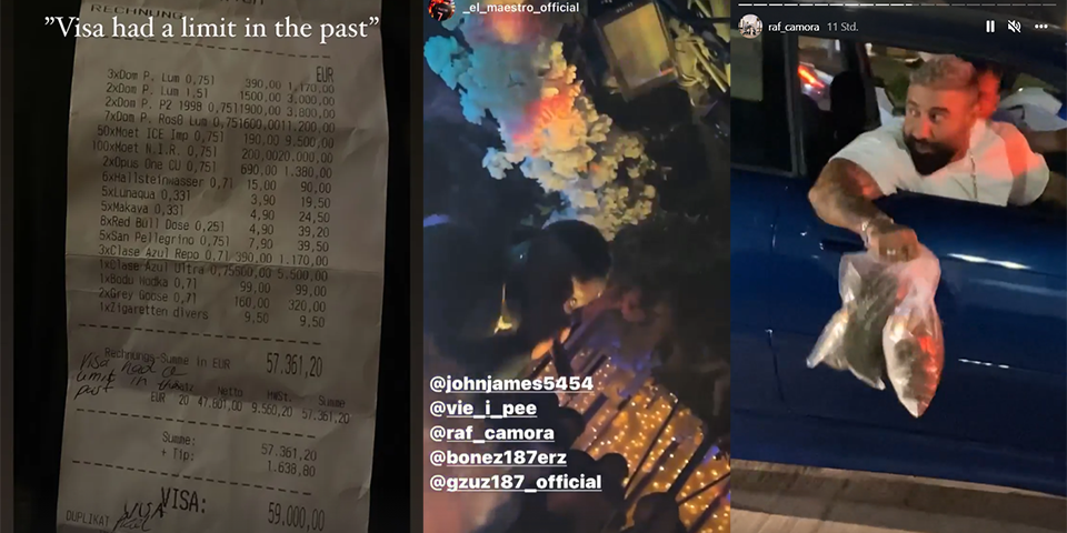 Die Rechnung von 59.000 Euro (57.361 plus Trinkgeld) scheint Immo-Unternehmer und Krypto-Millionär Mike Maschina übernommen zu haben. Auf der Rechnung stehen unter anderem 150 Flaschen Moet (29.500 Euro) und 14 Flaschen Dom Perignon (19.000 Euro) und Tequila im Wert von rund 6.600 Euro.